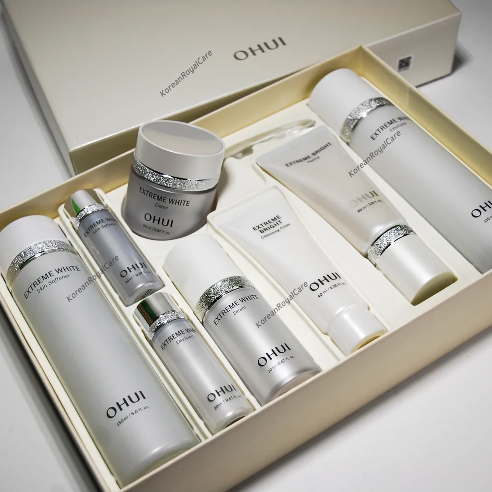 Корейский набор средств для лица с осветляющим действием O HUI extreme white 4pcs set - отбеливающая линия создана на основе инновационных разработок и направлена на очищение, восстановление кожи и борьбу с пигментацией. В состав подарочного набора входит: - OHUI Extreme White Skin Softener 150ml + 20ml - осветляющий тонер для лица - смягчает кожу, успокаивает раздражение, помогает осветлить покраснения, справиться с проблемами постакне и пигментацией. - OHUI Extreme White Emulsion 130ml + 20ml - осветляющая эмульсия - эффективно увлажняет и питает кожные покровы, напитывая их коктейлем полезных веществ и энергией. - OHUI Extreme White Cream 20ml - отбеливающий крем для лица - осветляющий и успокаивающий крем для лица с ниацинамидом - восстанавливает яркость и чистоту тона. Сохраняет и поддерживает эластичность и упругость кожи, способствует улучшению текстуры кожи. - OHUI Extreme White Serum 20ml - отбеливающая эссенция для лица - OHUI Extreme Bright Peeling 60ml - отбеливающий пилинг для лица - Средство восстанавливает яркость и чистоту тона. Сохраняет и поддерживает эластичность и упругость кожи, способствует улучшению текстуры кожи. - OHUI Extreme Bright Cleansing Foam 40ml - отбеливающая пенка для умывания - очищает кожу от ороговевших клеток кожи, восстанавливая яркость и чистоту тона. Сохраняет и поддерживает эластичность и упругость кожи. Снимает раздражение, успокаивает кожу. В сочетании с передовыми технологиями O HUI комплекс Snow Vitamin представляет собой серию отбеливающих и увлажняющих средств, которые борются с темными пятнами и неровным тоном кожи, делая ее сияющей и гладкой после нанесения. Не упустите возможность испытать этот роскошный подарочный набор корейской косметики и насладиться его непревзойденными результатами. Идеальный подарок маме, подруге, сестре, любимой, на день рождения, 8 марта, день матери, новый год и просто так!
